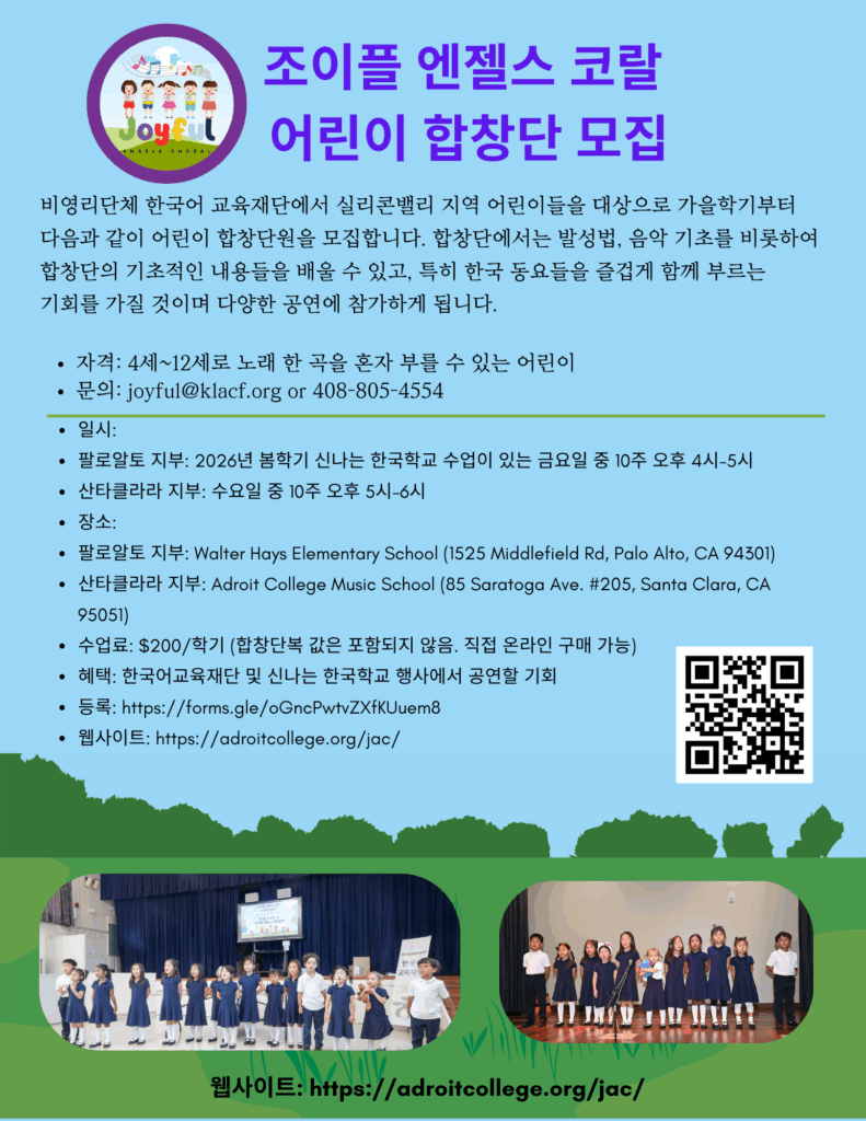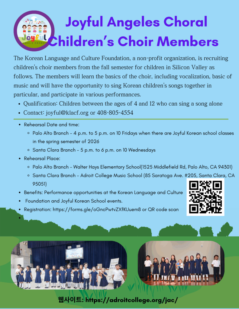 The Korean Language and Culture Foundation, a non-profit organization, is recruiting children’s choir members from the fall semester for children in Silicon Valley as follows. The members will learn the basics of the choir, including vocalization, basic of music and will have the opportunity to sing Korean children’s songs together in particular, and participate in various performances.
